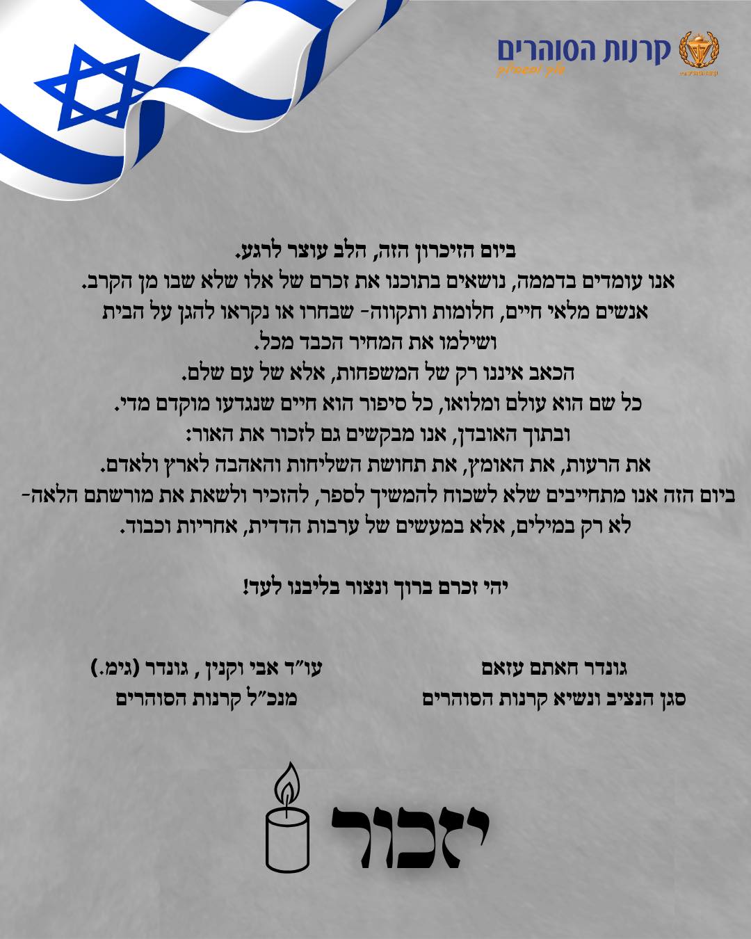 לצפייה באיגרת מנכ"ל קרנות ליום הזיכרון לחללי מערכות ישראל ולנפגעי פעולות האיבה – לחץ כאן!
